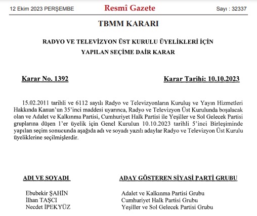 Türkiye Büyük Millet Meclisi’nde yapılan gizli oylama ile AKP kontenjanından Ebubekir Şahin, CHP kontenjanından İlhan Taşçı ve Yeşil Sol Parti kontenjanından Necdet İpekyüz RTÜK Üyeliğine seçildi.