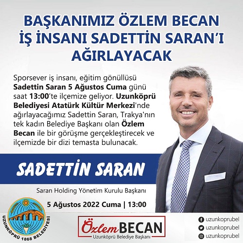 "Sporsever iş insanı, eğitim gönüllüsü Sadettin Saran 5 Ağustos Cuma günü saat 13:00’te ilçemize geliyor. Uzunköprü Belediyesi Atatürk Kültür Merkezi'nde ağırlayacağımız Sadettin Saran, Trakya'nın tek kadın Belediye Başkanı olan Özlem Becan ile bir görüşme gerçekleştirecek ve ilçemizde bir dizi temasta bulunacak." denildi.