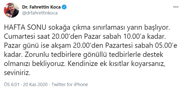 "HAFTA SONU sokağa çıkma sınırlaması yarın başlıyor. Cumartesi saat 20.00'den Pazar sabah 10.00'a kadar. Pazar günü ise akşam 20.00'den Pazartesi sabah 05.00’e kadar. Zorunlu tedbirlere gönüllü tedbirlerle destek olmanızı bekliyoruz. Kendinize ek kısıtlar koyarsanız, seviniriz."