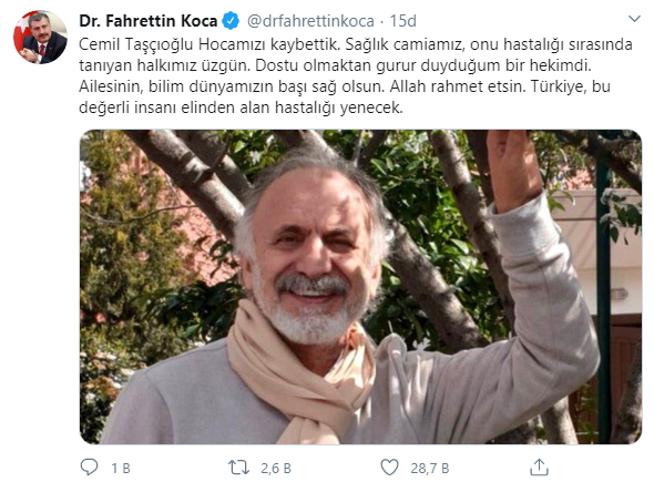 Sağlık Bakanı Dr. Fahrettin Koca, Koronavirüs tedavisi devam ederken hayatını kaybeden İstanbul Çapa Tıp Fakültesi Dahiliye Profesörü Cemil Taşçıoğlu ile ilgili sosyal medya hesabı üzerinden başsağlığı mesajı yayınladı.
