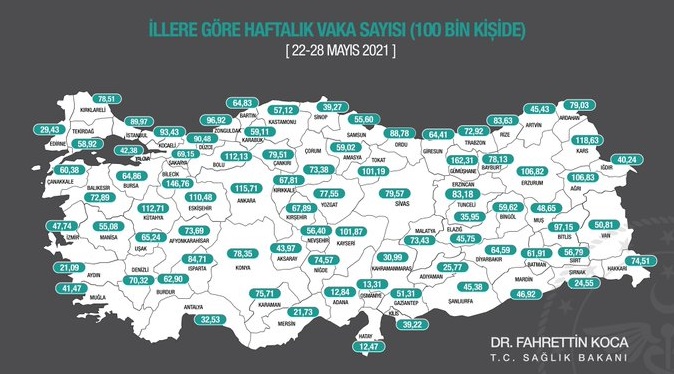 Sağlık Bakanı Dr. Fahrettin Koca, İllere göre 100 binde 22-28 Mayıs 2021 tarihli haftanın toplam vaka sayısını gösteren insidans haritasını ve aynı haftanın vaka sayısı en çok azalan illerimizi açıkladı.