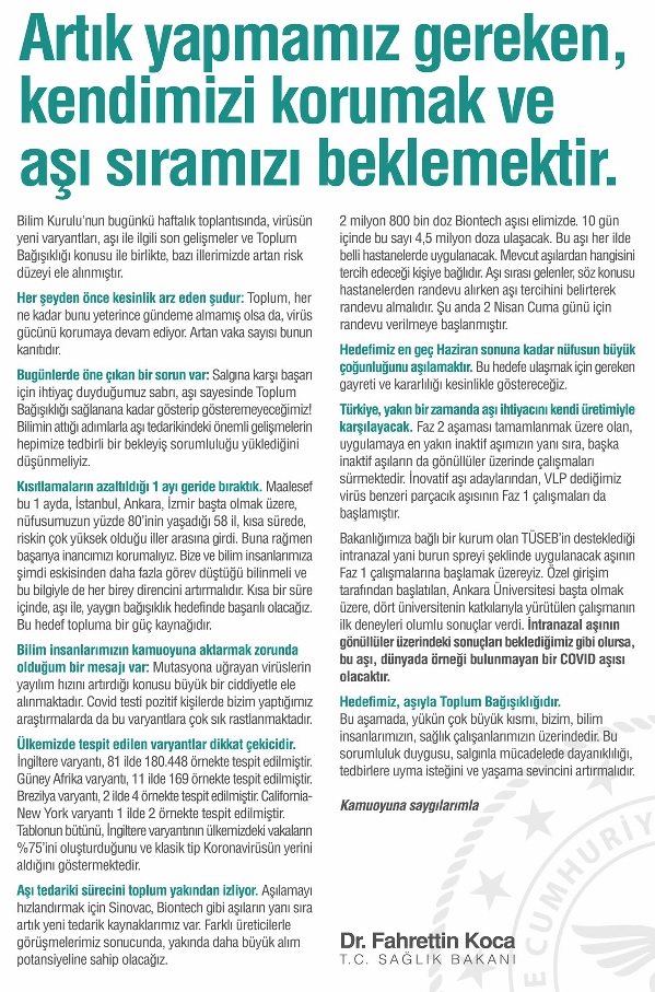 Sağlık Bakanı Dr. Fahrettin Koca 31 Mart Bilim Kurulu toplantısı sonrası yaptığı yazılı açıklamasında; 'Artık yapmamız gereken, kendimizi korumak ve aşı sıramızı beklemektir. Hedefimiz en geç Haziran sonuna kadar nüfusun büyük çoğunluğunu aşılamaktır.'