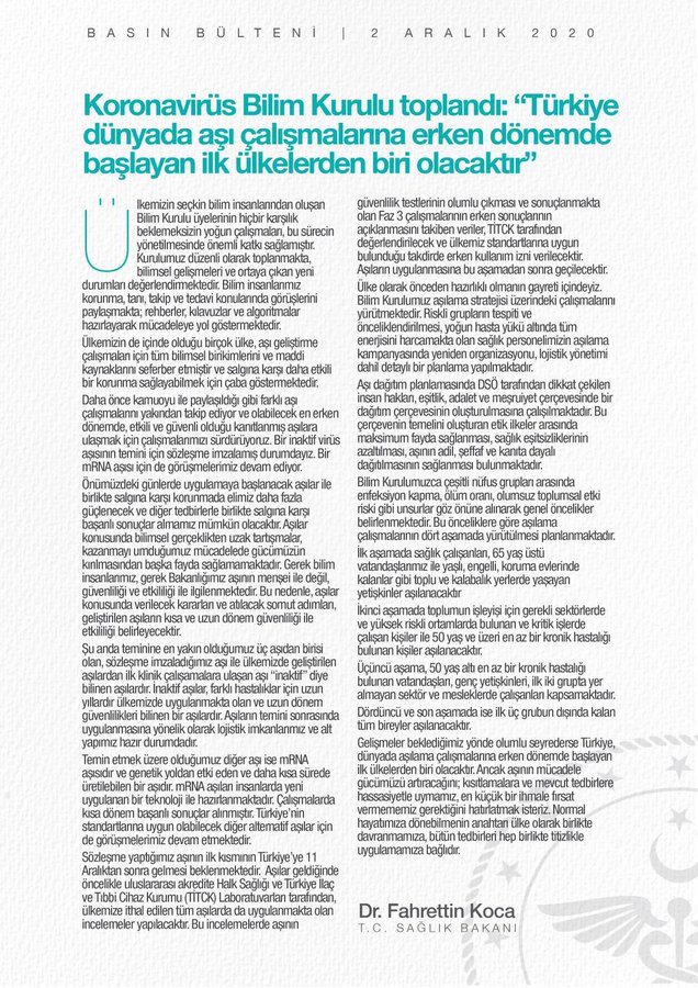 Gelişmeler beklediğimiz yönde olumlu seyrederse Türkiye, dünyada aşılama çalışmalarına erken dönemde başlayan ilk ülkelerden biri olacaktır. Ancak aşının mücadele gücümüzü artıracağını; kısıtlamalara ve mevcut tedbirlere hassasiyetle uymamız, en küçük bir ihmale fırsat vermememiz gerektiğini hatırlatmak isteriz. Normal hayatımıza dönebilmenin anahtarı ülke olarak birlikte davranmamıza, bütün tedbirleri hep birlikte titizlikle uygulamamıza bağlıdır."
