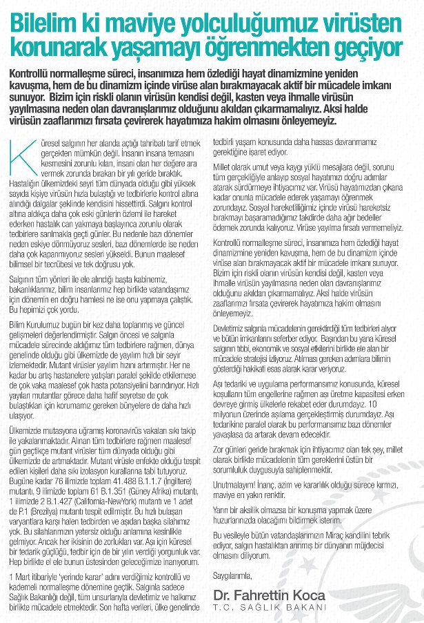 Kontrollü normalleşme süreci, insanımıza hem özlediği hayat dinamizmine yeniden kavuşma, hem de bu dinamizm içinde virüse alan bırakmayacak aktif bir mücadele imkanı sunuyor. Bizim için riskli olanın virüsün kendisi değil, kasten veya ihmalle virüsün yayılmasına neden olan davranışlarımız olduğunu akıldan çıkarmamalıyız. Aksi halde virüsün zaaflaeımızı fırsata çevirerek hayatımıza hakim olmasını önleyemeyiz.