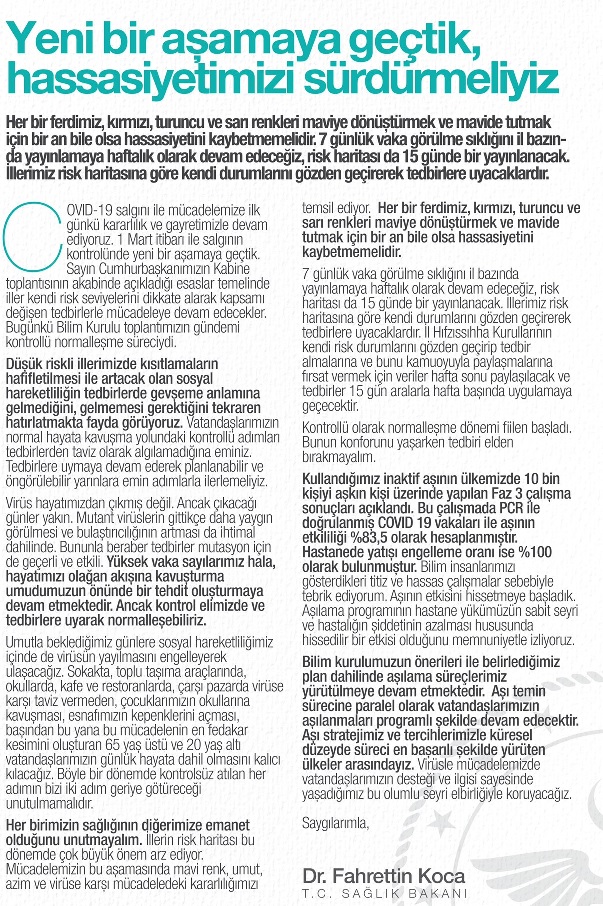 Sağlık Bakanı Dr. Fahrettin Koca; 'Covid-19 salgını ile mücadelemize ilk günkü kararlılık ve gayretimizle devam ediyoruz. 1 Mart itibarı ile salgının kontrolünde yeni bir aşamaya geçtik. Bugünkü Bilim Kurulu toplantımızın gündemi kontrollü normalleşme süreciydi.'