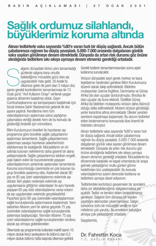 Sağlık Bakanı Dr. Fahrettin Koca, Bilim Kurulu toplantısı sonrası yaptığı yazılı basın açıklamasında; "Bilim Kurulumuzun önerisiyle yarından itibaren 75 yaş üzeri büyüklerimiz randevu alarak aşı olabilecekler. Büyüklerimizi daha iyi koruyabileceğiz" dedi.