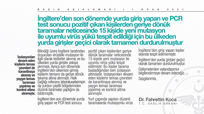 Sağlık Bakanı Dr. Fahrettin Koca açıkladı; "İngiltere kaynaklı mutasyon sebebiyle yapılan incelemelerde bu ülkeden yurda giriş yapan 15 kişide mutasyonlu virüs tespit edilmiş ve kontrol altına alınmıştır. İngiltere’den yurda girişler geçici olarak tamamen durdurulmuştur.'