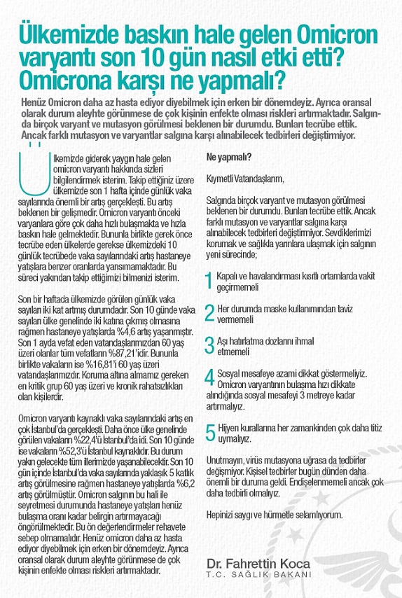 Sağlık Bakanı Dr. Fahrettin Koca 2021 son basın açıklamasında; Ülkemizde baskın hale gelen Omicron varyantı son 10 gün nasıl etki etti? Omicrona karşı ne yapmalı? yazılı olarak kamuoyuyla paylaştı.