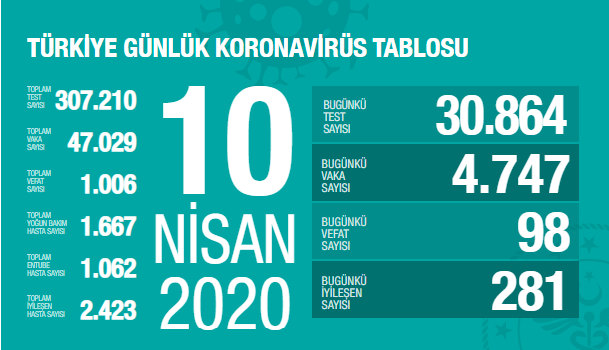 Sağlık Bakanlığı, 10 Nisan koronavirüs salgını hakkındaki son günlük verilerini paylaştı. Buna göre; "günlük yapılan 28.578 testin 4.747 pozitif, toplam 47.029 hasta, bugün 98, toplamda 1.006 kişi hayatını kaybetti."