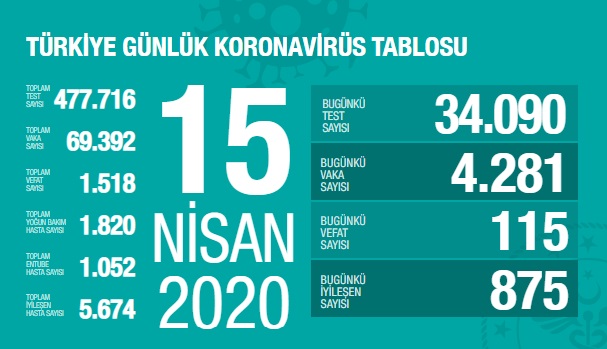 Sağlık Bakanlığı, 15 Nisan koronavirüs salgını hakkındaki son günlük verilerini paylaştı. Buna göre; "günlük yapılan 34.090 testin 4.281 pozitif, toplam 69.392 hasta, bugün 115, toplamda 1.518 kişi hayatını kaybetti."