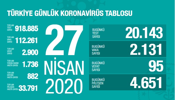 Sağlık Bakanlığı, 27 Nisan Türkiye'deki Koronavirüs Covid_19 salgını hakkındaki son günlük verilerini paylaştı. Buna göre; "günlük yapılan 20.143 testin 2.131 pozitif, toplam 112.261 hasta, bugün 95, toplamda 2.900 kişi hayatını kaybetti."