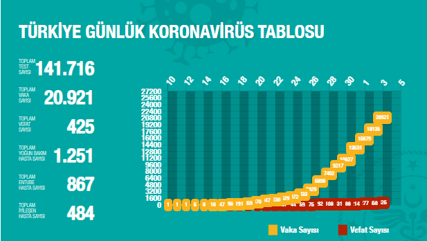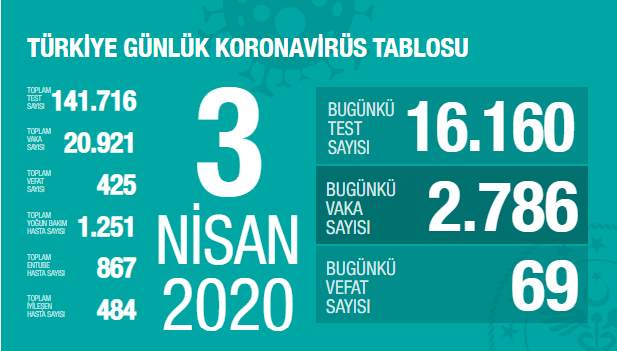 Sağlık Bakanı Dr. Fahrettin Koca twitter hesabından, Sağlık Bakanlığının 3 Nisan koronavirüs salgını hakkında son günlük verilerini paylaştı. "günlük yapılan 16.716 testin 2.786 pozitif, toplam 20.921 hasta, bugün 69, toplamda 425 kişi hayatını kaybetti."