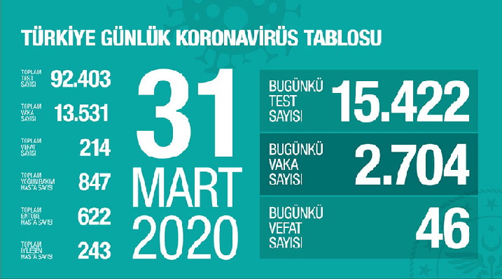 Sağlık Bakanı Dr. Fahrettin Koca twitter hesabından, Sağlık Bakanlığının 31 Mart koronavirüs salgını hakkında son günlük verilerini paylaştı; "günlük yapılan 15.422 testin 2.704 pozitif, toplam 13.531 hasta, bugün 46, toplamda 214 kişi hayatını kaybetti"