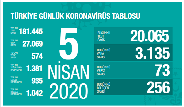Sağlık Bakanlığı 5 Nisan koronavirüs salgını hakkındaki son günlük verilerini paylaştı. Buna göre; "günlük yapılan 20.065 testin 3.135 pozitif, toplam 27.065 hasta, bugün 73, toplamda 574 kişi hayatını kaybetti."