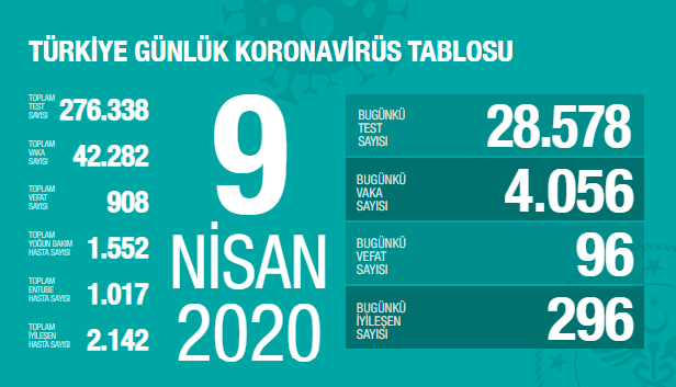 Sağlık Bakanlığı, 9 Nisan koronavirüs salgını hakkındaki son günlük verilerini paylaştı. Buna göre; "günlük yapılan 28.578 testin 4.056 pozitif, toplam 42.282 hasta, bugün 96, toplamda 908 kişi hayatını kaybetti."