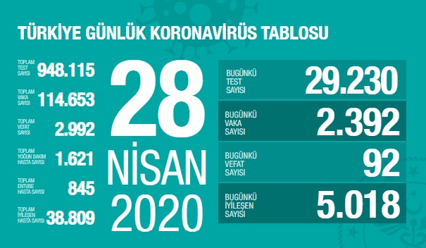 Sağlık Bakanlığı resmi sitesinde 28 Nisan tarihli Türkiye'deki Koronavirüs Covid_19 salgını hakkındaki son günlük verileri paylaştı. Buna göre; "günlük yapılan 29.230 testin 2.392 pozitif, toplam 114.653 hasta, bugün 92, toplamda 2.992 kişi hayatını kaybetti."