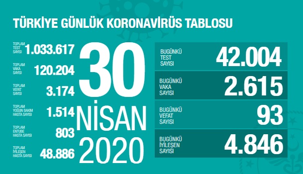 Sağlık Bakanlığı resmi sitesinde 30 Nisan tarihli Türkiye'deki Koronavirüs Covid_19 salgını hakkındaki son günlük verileri paylaştı. Buna göre; "günlük yapılan 42.004 testin 2.615 pozitif, toplam 120.204 hasta, bugün 93, toplamda 3.174 kişi hayatını kaybetti."