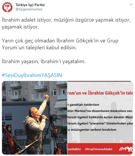 İbrahim adalet istiyor, müziğini özgürce yapmak istiyor, yaşamak istiyor. Yarın çok geç olmadan İbrahim Gökçek'in ve Grup Yorum'un talepleri kabul edilsin. İbrahim yaşasın, İbrahim'i yaşatalım.