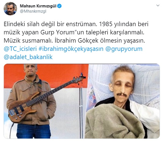 Sanatçılardan Mahsun Kırmızıgül İçişleri Bakanlığı ve Adalet Bakanlığını da ekleyerek yaptığı paylaşım ve çağrıda; "Elindeki silah değil bir enstrüman. 1985 yılından beri müzik yapan Gurp Yorum”un talepleri karşılanmalı. Müzik susmamalı. İbrahim Gökçek ölmesin yaşasın. @TC_icisleri #ibrahimgökçekyaşasın @grupyorum @adalet_bakanlik" dedi.