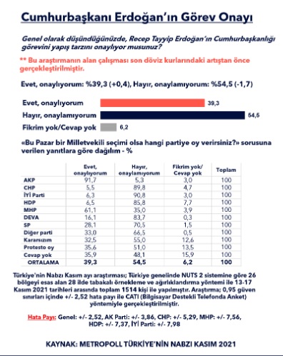 Metropoll Araştırma, kasım ayında yaptığı ankette Cumhurbaşkanı Erdoğan'ın görev onayını ele aldı.
