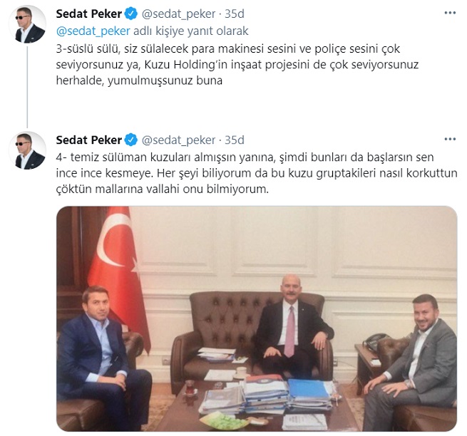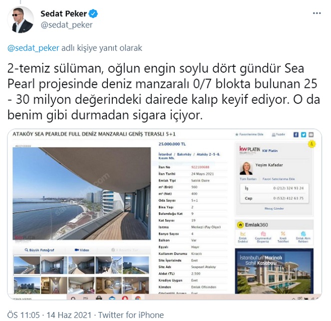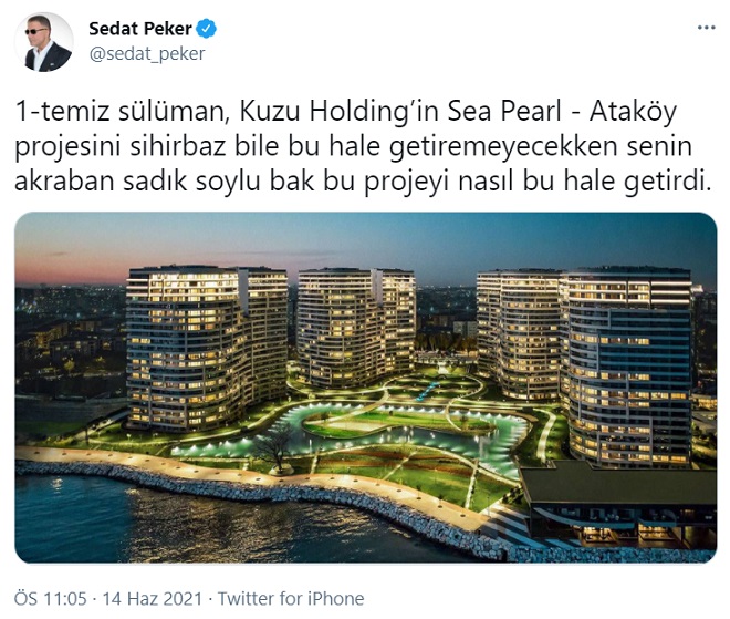 Sedat Peker yeni iddialar ile gündemi meşgul etmeye devam ediyor. Peker son paylaşımlarında; "temiz sülüman, Kuzu Holding’in Sea Pearl - Ataköy projesini sihirbaz bile bu hale getiremeyecekken senin akraban sadık soylu bak bu projeyi nasıl bu hale getirdi.