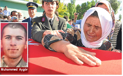 Bingöl’ün Genç İlçesi’ne bağlı Güzeldere Köyü kırsalında önceki akşam operasyondan dönerken karşılaştıkları bir grup PKK’lı ile çıkan çatışmada şehit düşen Komando Er Muhammet Aygör, dün memleketi Konya’da toprağa verildi. Yaklaşık 3 bin kişinin katıldığı törende şehidin annesi Cemile Aygör, oğlunun tabutuna sarılarak gözyaşı döktü. “Ayaktayım oğlum, kimseyi güldürmeyeceğim” diyerek gözyaşı döken anne Aygör’ü, bayan askeri personel ile yakınları sakinleştirmeye çalıştı. Şehit Aygör’ün cenazesi, Konya İl Müftüsü Şükrü Özbuğday’ın kıldırdığı cenaze namazının ardından dualar eşliğinde belde mezarlığında toprağa verildi.
