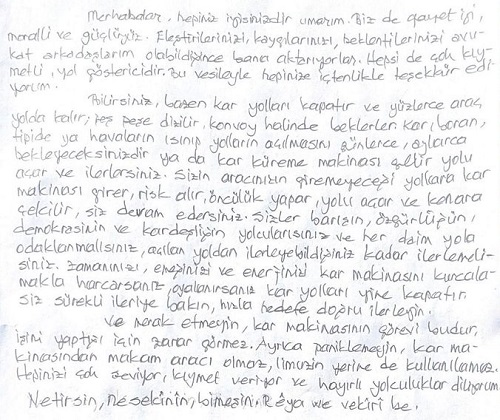 Sizler barışın, özgürlüğün, demokrasinin ve kardeşliğin yolcularısınız ve her daim yola odaklanmalısınız, açılan yoldan ilerleyebildiğiniz kadar ilerlemelisiniz. Zamanınızı emeğinizi ve enerjinizi kar makinasını kurcalamakla harcarsanız oyalanırsınız, kar yolları iyice kapatır.