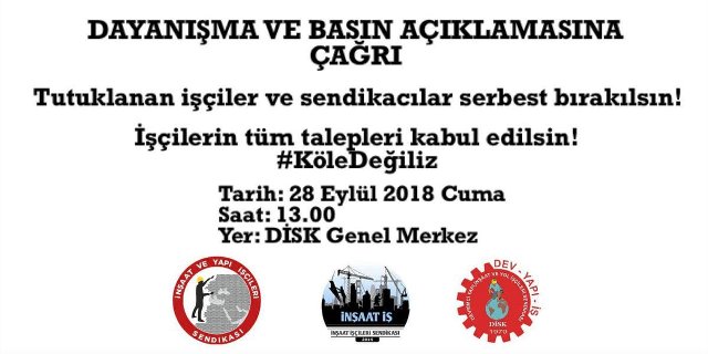 28 Eylül Cuma günü saat 13:00’te DİSK Genel Merkez binasında yapacağımız basın açıklamasıyla hem dayanışma çağrımızı duyuracak hem de imzacı kurumları açıklayacağız.