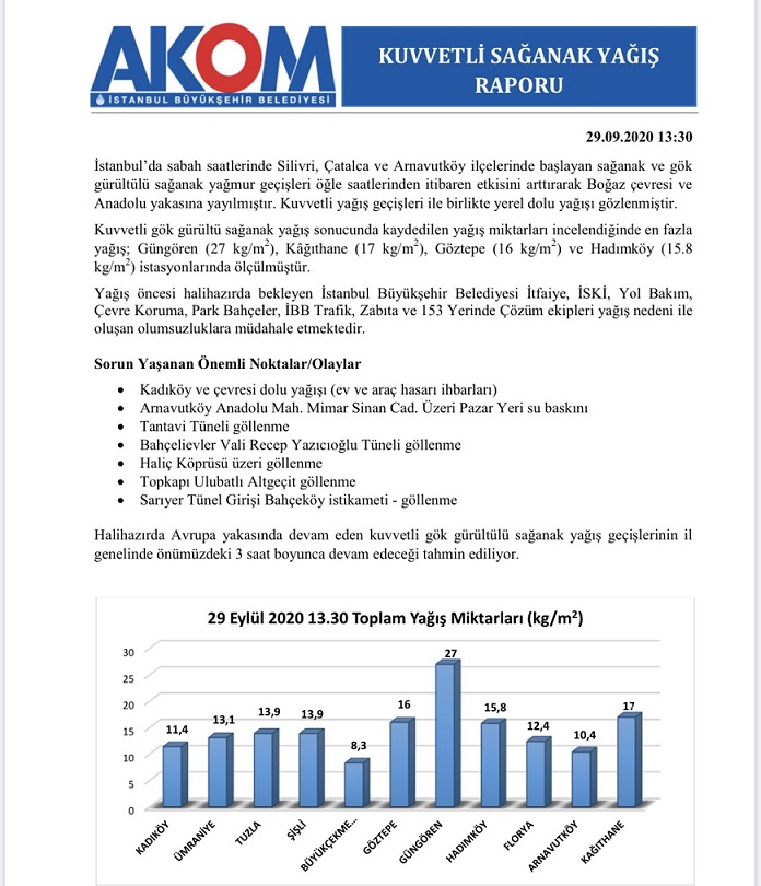 İBB Sözcüsü Murat Ongun sosyal medya hesabından İstanbul’da etkili olan şiddetli yağmur ve dolu yağışı sonrası İBB AKOM yağış veri raporunu paylaştı. Murat Ongun, paylaşımında AKOM'un "Kuvvetli Sağanak Yağış Raporu" ile ""İstanbul’da sabah saatlerinde başlayan sağanak yağış geçişleriyle birlikte yerel dolu yağışı gözlenmiştir. Yağış öncesi hazırda bekleyen tüm İBB ekipleri yaşanan olumsuzluklara müdahale etmektedir. Olumsuz durumlarda @ibbBeyazmasa ile iletişim kurulabilir" ifadelerini paylaştı.