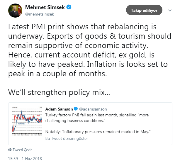 Başbakan Yardımcısı Mehmet Şimşek, sosyal medya hesabı Twitter'da İngilizce yazdığı mesajında Nisan 2009'dan bu yana en düşük seviyeyi gören imalat sanayi satın alma yöneticisi endeksine (PMI) atıfta bulundu.