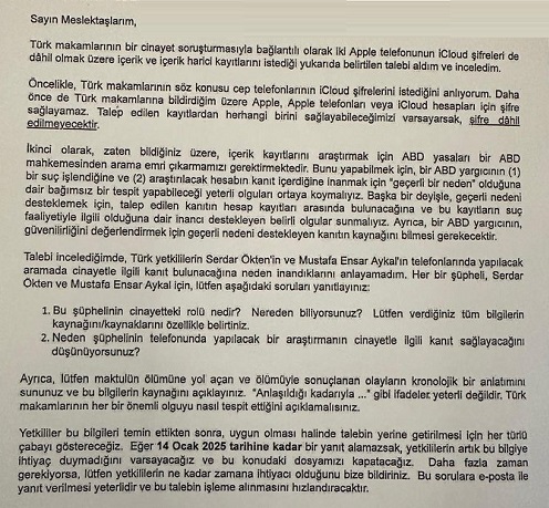 Eski Ülkü Ocakları Başkanı Sinan Ateş'in öldürülmesine ilişkin görülen davada Apple'dan mahkemenin şifre talebine yanıt geldi. Mahkemeden sanıklar Mustafa Ensar Aykal ve Serdar Öktem hakkında daha detaylı açıklamalar isteyen Apple, “Yetkililer bilgileri temin ettikten sonra, uygun olması halinde talebin yerine getirilmesi için her türlü çabayı göstereceğiz” diyerek 14 Ocak 2025’e kadar zaman verdi.