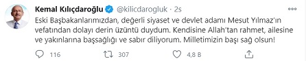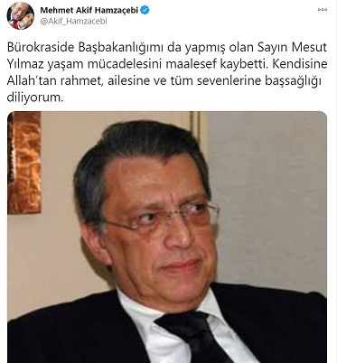 CHP İstanbul Milletvekili Akif Hamzacebi; "Bürokraside Başbakanlığımı da yapmış olan Sayın Mesut Yılmaz yaşam mücadelesini maalesef kaybetti. Kendisine Allah’tan rahmet, ailesine ve tüm sevenlerine başsağlığı diliyorum."