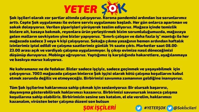 ŞOK çalışanları; "Bugünden itibaren kocaman bir sesle #YETERŞOK diyeceğiz, her mağazada. Zorlayarak sözleşme imzalatamayacak, işten çıkarmalarla bizi tehdit edemeyeceksiniz çünkü biz Şok işçileri olarak yan yana gelmeye kararlıyız" dedi.