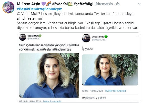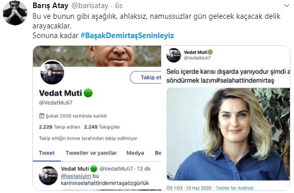 Twitter'da "@VedatMuti7" isimli troll olduğu belirtilen hesaptan HDP eski Eş Genel Başkanı Selahattin Demirtaş'ın eşi Başak Demirtaş hakkında çirkin paylaşımda bulunuldu. Gerçek isminin Vedat Yazıcı olduğu, "yeşil top" işaretli hesap sahibi olduğu belirtilen hesaptan Başak Demirtaş'la ilgili "Selo içerde karısı dışarıda... " ifadeleri paylaşıldı.