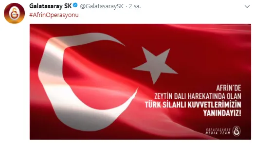 Trabzonspor Kulübü "O mübarek bayrak işte bu bayrak! Zeytin Dalı Harekatına çıkan Mehmetçiklerimize selam olsun. Dualarımız kahraman askerlerimizle.", Bursaspor Kulübü, "Allah yâr ve yardımcınız olsun.", Atiker Konyaspor da "Afrin Operasyonu'nda tüm dualarımız Mehmetçiklerimizle." mesajlarını sosyal medya hesaplarından yayımladı.