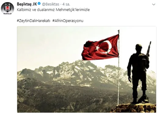 Türk Silahlı Kuvvetlerince (TSK), hudut güvenliği ve bölgede istikrarı sağlamak maksadıyla, Suriye'nin kuzeybatısında Afrin bölgesinde, PKK/KCK/PYD-YPG ve DEAŞ'a mensup teröristleri etkisiz hale getirmek, dost ve kardeş bölge halkını bunların baskı ve zulmünden kurtarmak üzere başlatılan Zeytin Dalı Harekatı'na katılan Mehmetçiğe, spor kulüpleri yayımladıkları mesajlarla destek verdi.