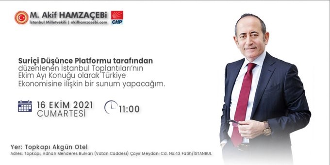 Cumhuriyet Halk Partisi İstanbul Milletvekili Mehmet Akif Hamzacebi, Suriçi Düşünce Platformunun İstanbul toplantıları, Ekim ayı konuğu olacak. Toplantı, 16 Ekim 2021 Cumartesi günü saat:11.00'da Topkapı Akgün Otelde yapılacak.