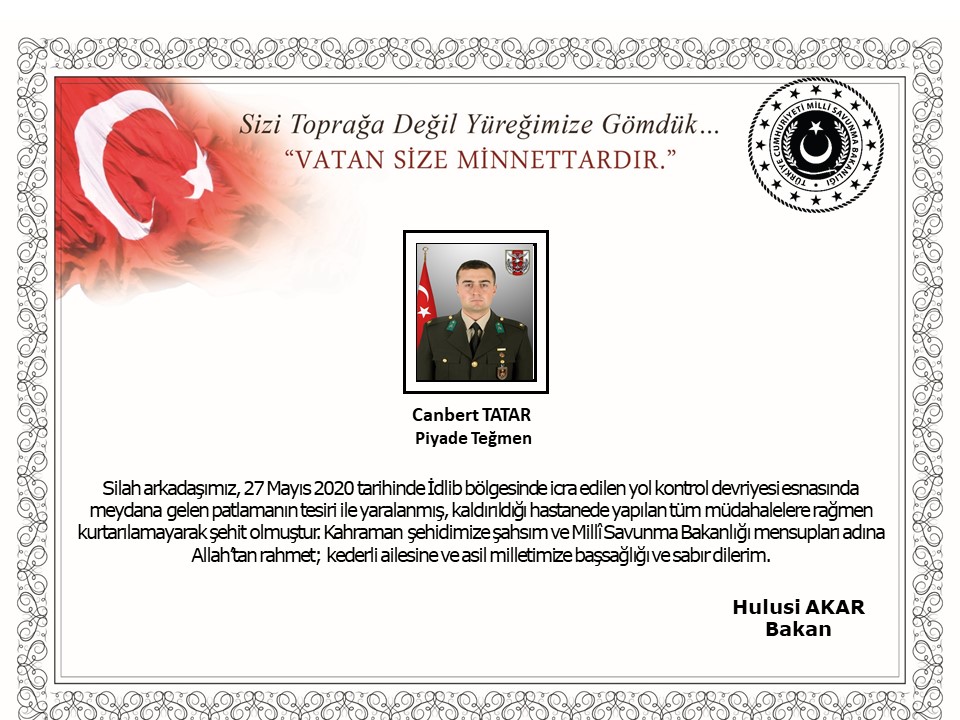 Suriye’nin İdlib bölgesinde yol kontrol devriyesi sırasında meydana gelen patlama sonucu askerimiz Piyade Teğmen Canbert Tatar şehit oldu.