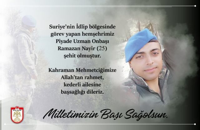 Sivas Valiliği resmi sosyal medya sayfasından; "Suriye’nin İdlip bölgesinde görev yapan hemşehrimiz, Piyade Uzman Onbaşı Ramazan Nayir (25) şehit olmuştur." denildi.
