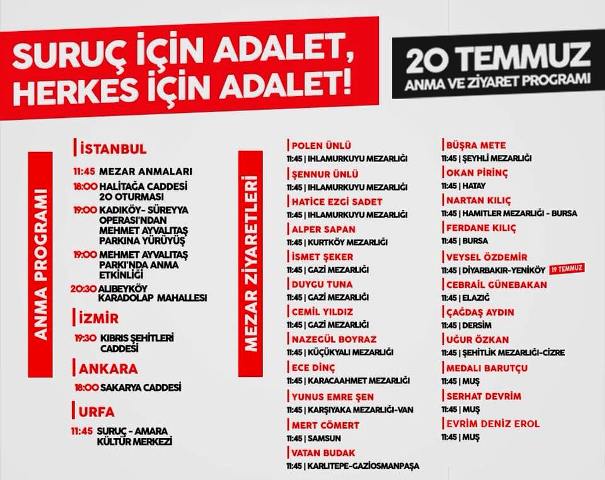 Katliamın üçüncü yıl dönümünde Suruç için adalet talebini yinelemek ve yaşamını yitiren 33 kişiyi anmak için İstanbul, Ankara ve İzmir olmak üzere birçok ilde eş zamanlı etkinlikler düzenleniyor.