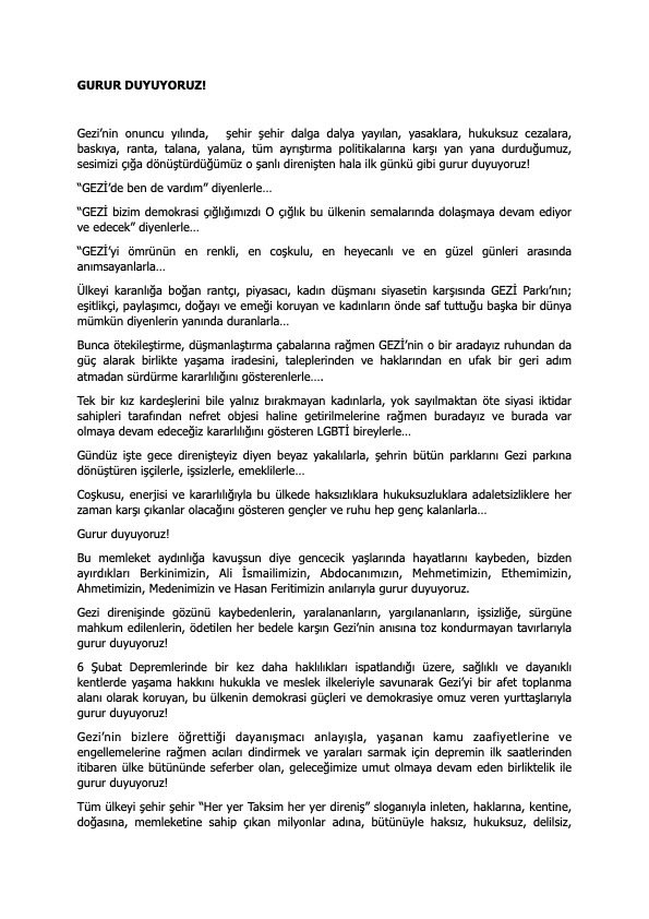 Taksim Dayanışmasından yapılan açıklamada; 10 yıl önce bütün güzellikleriyle hayatımıza giren Gezi Direnişi'nin yıl dönümünde, Eşitlik, özgürlük, demokrasi ve adalet talebimizden vazgeçmiyoruz: KARANLIK GİDER, GEZİ KALIR!