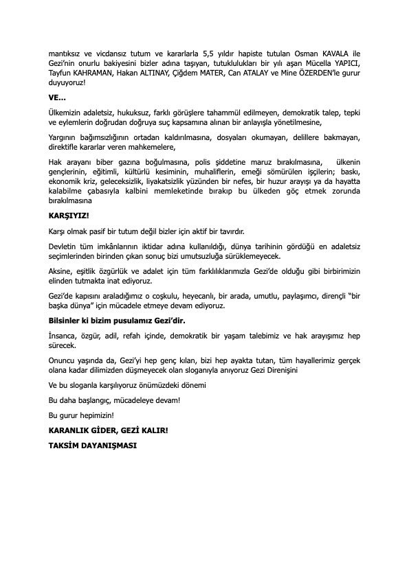Taksim Dayanışması; Onuncu yaşında da, Gezi’yi hep genç kılan, bizi hep ayakta tutan, tüm hayallerimiz gerçek olana kadar dilimizden düşmeyecek olan sloganıyla anıyoruz Gezi Direnişini, ve bu sloganla karşılıyoruz önümüzdeki dönemi: Bu daha başlangıç, mücadeleye devam!