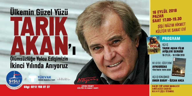 "Ülkemin Güzel Yüzü Tarık Akan'ı Ölümsüzlüğe Yolcu Edişimizin 2. Yılında Anıyoruz" başlıklı programda, 16 Eylül Pazar günü saat 17.00'da Şişli Belediyesi Nâzım Hikmet Kültür ve Sanat Evi'nde "Tarık Akan Film Afişleri Sergisi" açılacak. Sergi, 16 Ekim'e kadar ziyaretçilerine açık olacak.