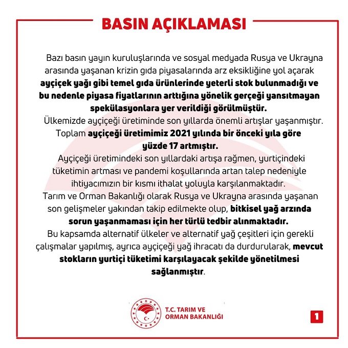 'Ayçiçek yağı gibi temel gıda ürünlerinde yeterli stok bulunmadığı yönünde paylaşılan bilgiler doğru değildir. Gerekli tedbirler alınmıştır. Ülkemizin yeterli miktarda ayçiçek yağı stoku bulunmaktadır. Asılsız iddialara itibar etmeyin. Endişe edilecek bir durum söz konusu değildir'