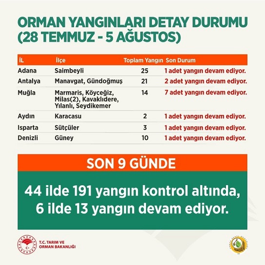 Tarım ve Orman Bakanı Bekir Pakdemirli, 28 Temmuz- 5 Ağustos arasındaki orman yangınları detay durumunu Twitter hesabından açıkladı. Pakdemirli açıklıklamasında, "Ormanın kahramanlarının 6 ilde 13 adet orman yangınını kontrol altına alma çalışmaları büyük bir özveri ile devam ediyor. Son 9 günde ise 44 ilde 191 orman yangını kontrol altına alındı" dedi.