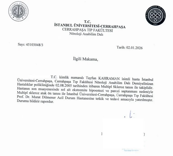 Kahraman, MS atağı geçirdiği için Cerrahpaşa Tıp Fakültesi’ne yatırıldı. Hastane yazısında Kahraman’da ‘sol alt ekstremite hipoestezi ve parezi saptandığı’ vurgulandı.