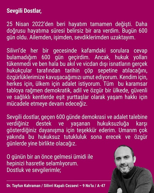 Tayfun Kahraman, yazdığı mektubunda; 25 Nisan 2022'den beri hayatım tamamen değişti. Daha doğrusu hayatıma süresi belirsiz bir ara verdim. Bugün 600 gün oldu. Ailemden eşimden sevdiklerimden uzaktayım.