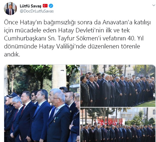 Hatay Valiliğinde düzenlenen törende, Vali Rahmi Doğan, Atatürk ve Tayfur Sökmen anıtlarına çelenk sundu, saygı duruşunda bulunuldu ve İstiklal Marşı okundu. Hatay Büyükşehir Belediye Başkanı Lütfü Savaş anma töreniyle ilgili sosyal medya hesabından "Önce Hatay'ın bağımsızlığı sonra da Anavatan'a katılışı için mücadele eden Hatay Devleti'nin ilk ve tek Cumhurbaşkanı Sn. Tayfur Sökmen'i vefatının 40. Yıl dönümünde Hatay Valiliği'nde düzenlenen törenle andık"