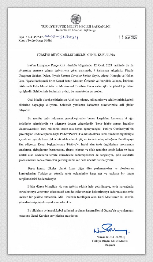 Meclis Başkanı Numan Kurtulmuş’un başkanlığını yaptığı TBMM Genel Kurulu Toplantısı’nda kabul edilen terör saldırılarına yönelik Meclis Başkanlığı tezkeresinde, "Türkiye Cumhuriyeti'nin tüm terör örgütleriyle içeride ve dışarıda kararlılıkla mücadele edecek güç ve kudrete sahip olduğunu tüm dünyaya ilan ediyoruz." denildi.