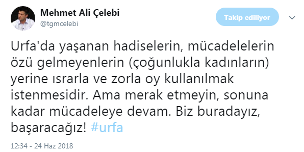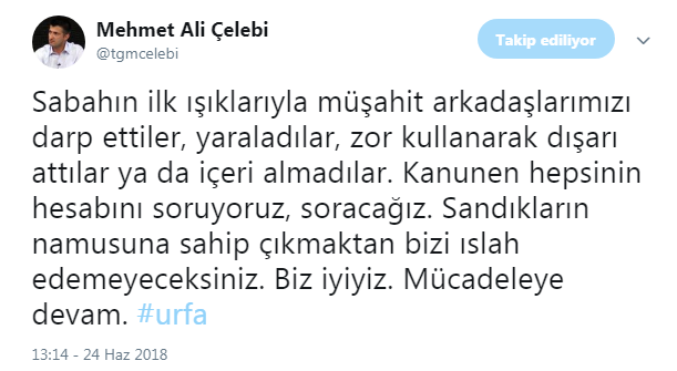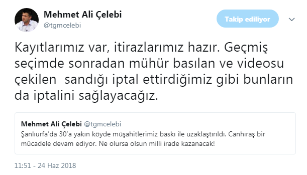 Çelebi, daha sonra "Şanlıurfa’da 30’a yakın köyde müşahitlerimiz baskı ile uzaklaştırıldı. Canhıraş bir mücadele devam ediyor. Ne olursa olsun milli irade kazanacak! Kayıtlarımız var, itirazlarımız hazır. Geçmiş seçimde sonradan mühür basılan ve videosu çekilen sandığı iptal ettirdiğimiz gibi bunların da iptalini sağlayacağız" diye yazdı.